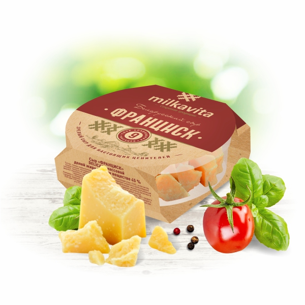 Сыр «Франциск» Delicate — это твердый сыр элитной группы для настоящих ценителей вкуса. Высочайшее качество и изысканность вкуса придает индивидуальная разработка рецепта наших сыроделов. Тонкость и деликатность твердого кусочка сыра подарит особые ощущения счастья, а хруст крохких кристаллов солей кальция поистине удивит своей тайной. Великолепно сочетается с красным и белыми винами, прекрасно выступает в сочетании со свежими овощами, фруктами, идеален в составе сырной тарелки.